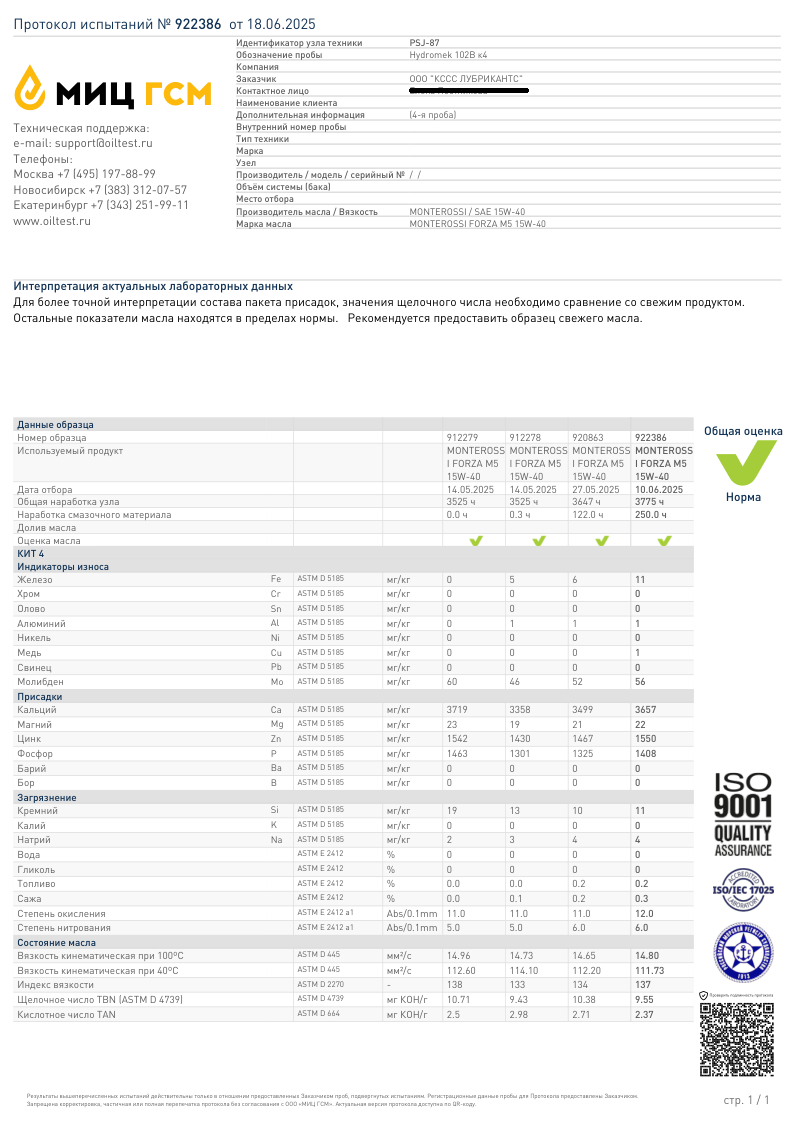 Все показатели масла находятся в допустимых для эксплуатации значениях и имеют запас